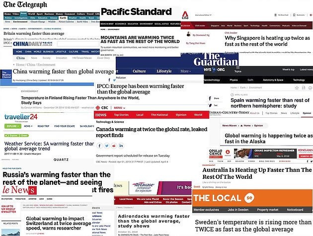 Apparently the climate change crisis is so bad that literally everywhere is heating twice as fast as the global warming average.